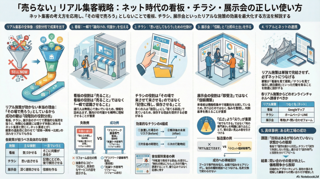 以下は、前回のネット集客と同じ考え方を軸に、リアル集客である看板・チラシ・展示会出展