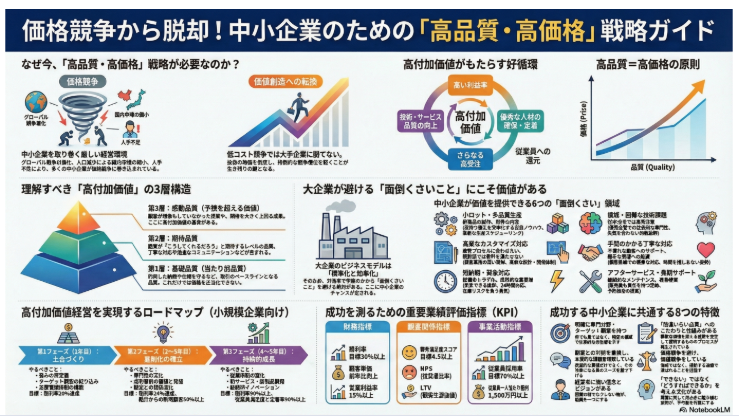 • 高付加価値戦略の意義:中小企業が価格だけで勝負しようとすると、利益がほとんど残らず、従業員は疲弊し、会社の体力はじわじわと失われていくという悪循環に陥ってしまいます。一方で、高付加価値戦略に成功した企業には、全く逆の好循環(高単価受注 → 利益率向上 → 従業員への還元 → 優秀な人材の確保・定着 → 技術・サービス品質の向上 → さらなる高単価受注)が生まれます。