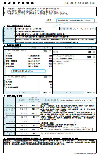 | 4. 必要な資金と調達 | 設備資金(見積ベース)+運転資金 | 資金使途が明確で、自己資金の準備があるか | 見積書を必ず取得。自己資金は積立過程を隠さず提示 |