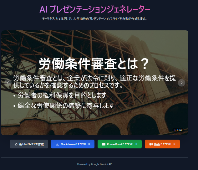 Gemini API を使用して、ユーザー提供のテーマに基づいて 10 スライドのプレゼンテーションを生成するアプリを作成してください。