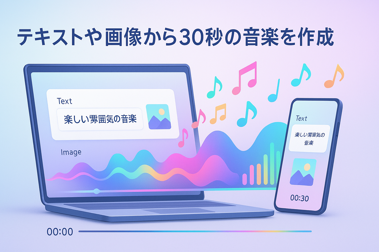 | 主な機能 | テキスト、画像、動画から30秒の音楽トラックや歌詞、カバーアートを自動生成。 |