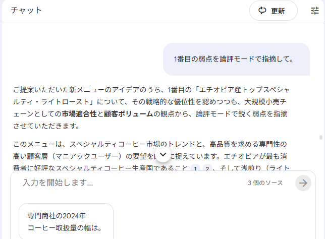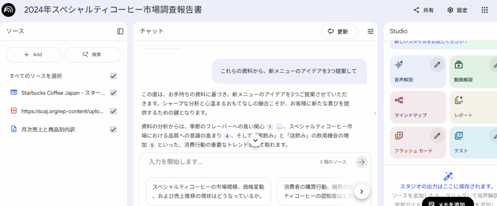 - チャット: 「これらの資料から、新メニューのアイデアを3つ提案して。」